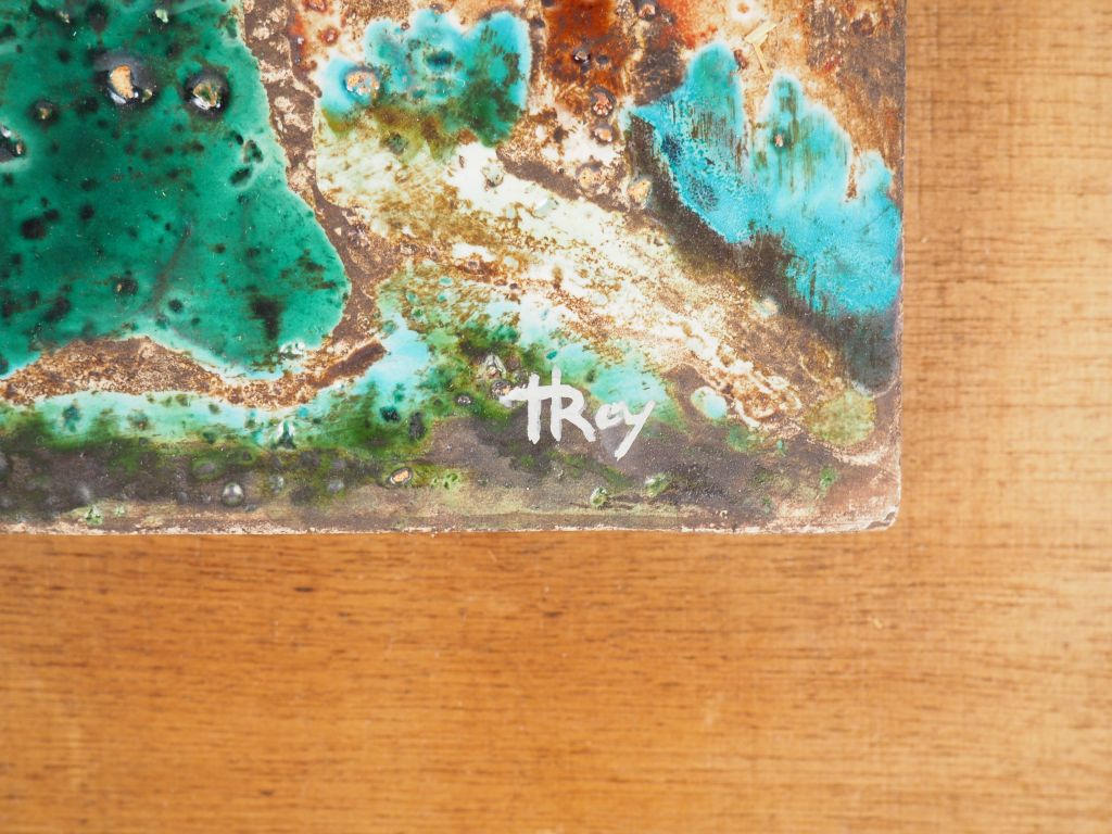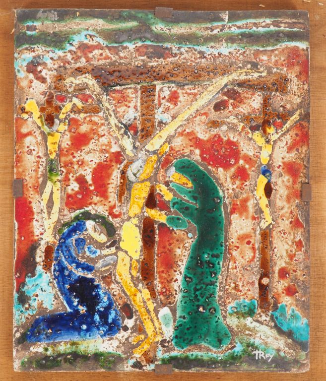 Henri Paul REY. "crucifixion" Plaque en céramique émaillée Signée Dim. 27 x 22 cm