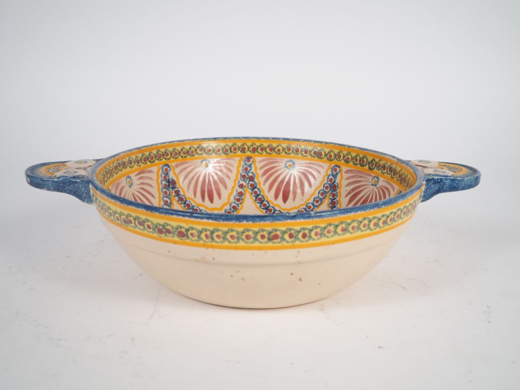 HENRIOT à Quimper. Coupe à anses en faïence polychrome à décor dans une réserve d'un joueur de cornemuse. Signé. Dim. 9 x 36 x 26 cm.