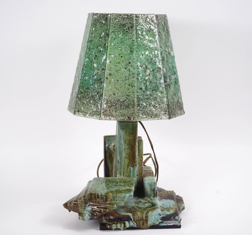 Lampe en céramique moderne à décor mêlé vert et brun, abat-jour en verre. H. 53 cm. (Chocs).