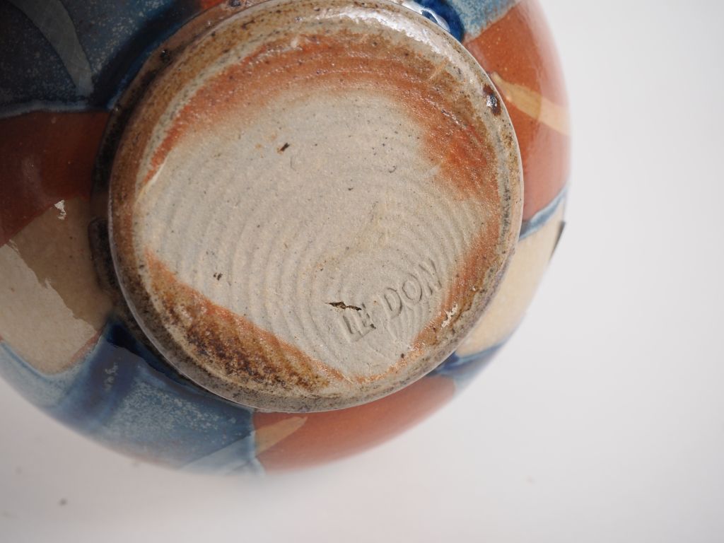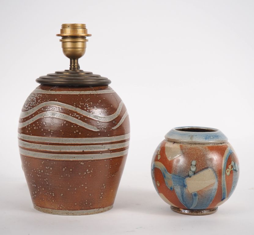 LE DON. Vase boule en céramique polychrome à décor abstrait. Dim. 13,5 x 13 cm. On y joint une lampe en céramique brune, signée LE DON. H. 22 cm.