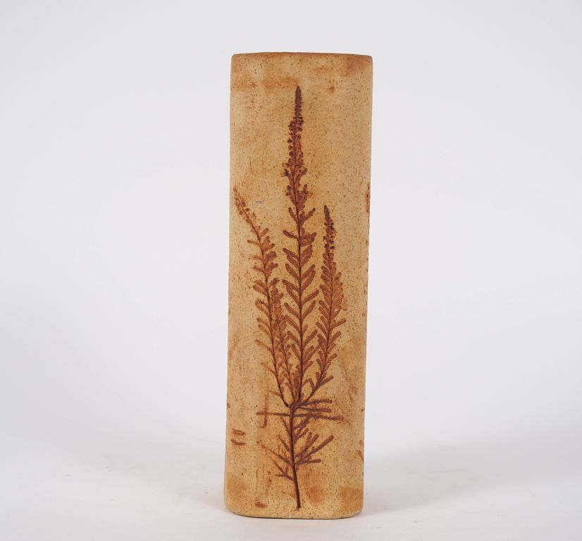 Lot de LEDUC. Vase en grès brun à décor de feuillage Signé H. 24,5 cm au prix de 30 à 50 € en vente aux enchères par l'hôtel des ventes Primardeco
