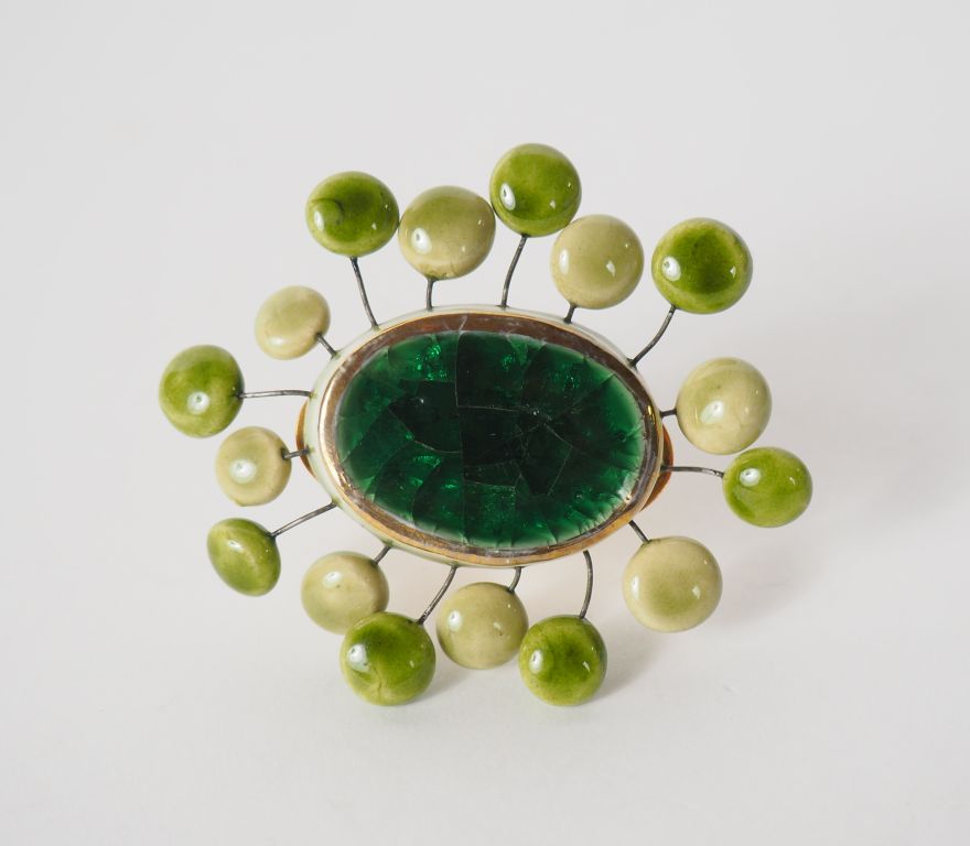 Mithé ESPELT. Broche en céramique verte. Dim. 7 x 6,5 cm.