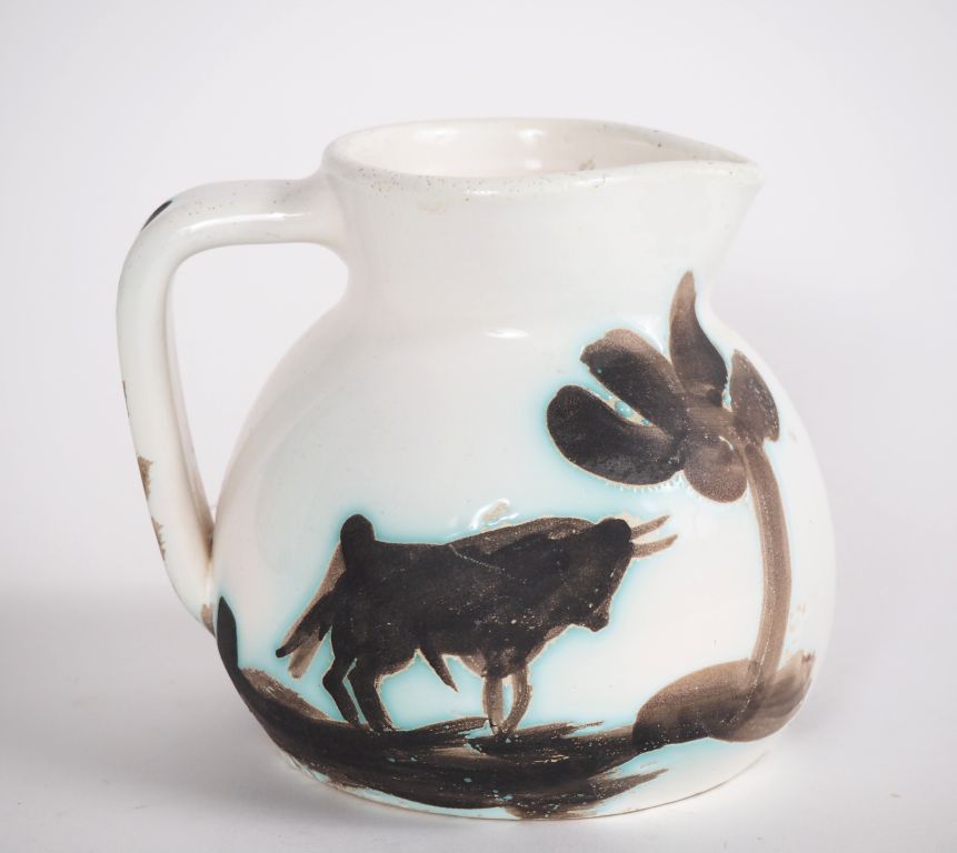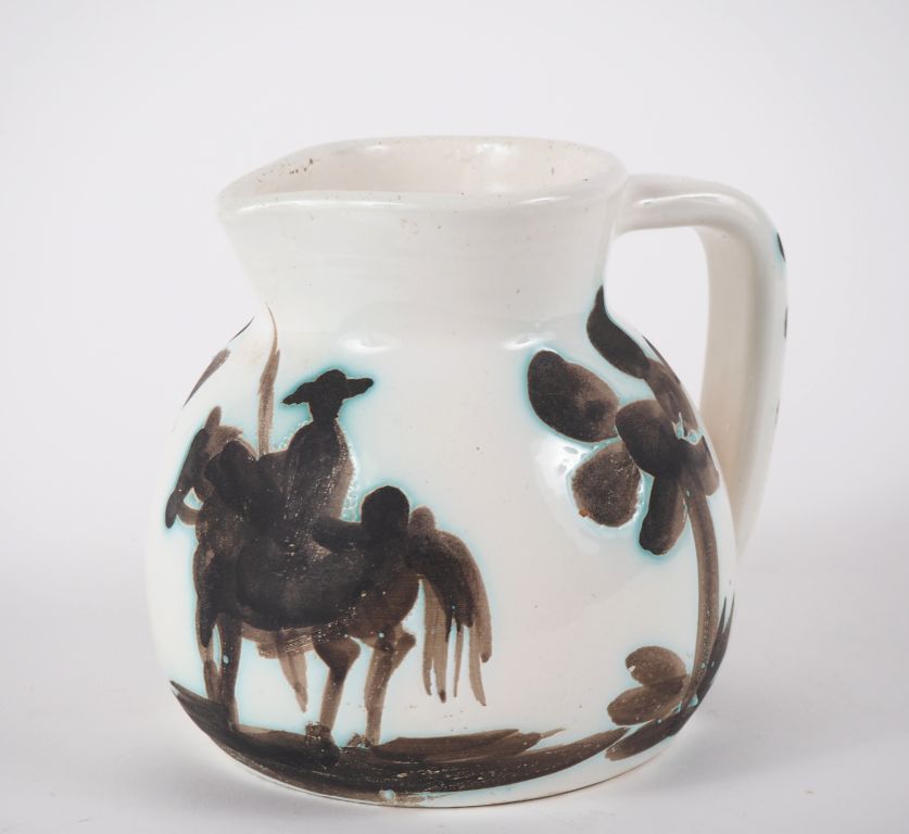 Pablo PICASSO pour MADOURA. Pichet "Taureau et picador" en céramique. Signé “Édition Picasso” et cachet en creux "Madoura plein feux". H. 14 cm. (bulles de cuisson et petits retraits de matière)