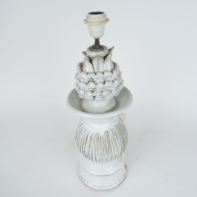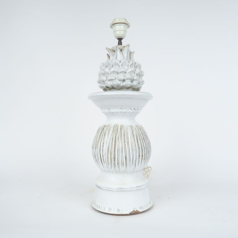 Pied de lampe 1960 en grés blanc en forme de balustre supportant un ananas. H. 46 cm. (égrenure, ou manque de couverte d'origine, à la base sur 3 cm.)