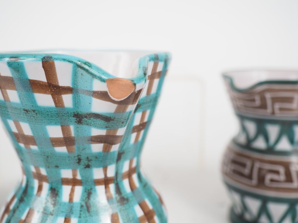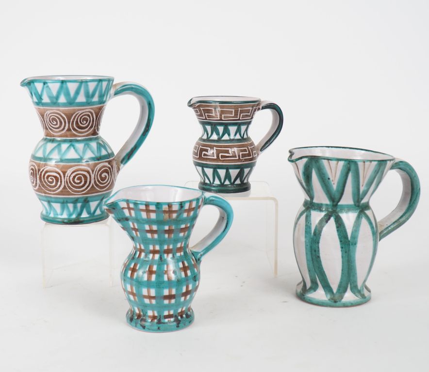 Robert PICAULT. Quatre differentes verseuses en céramique polychrome. (choc sur une des verseuses)