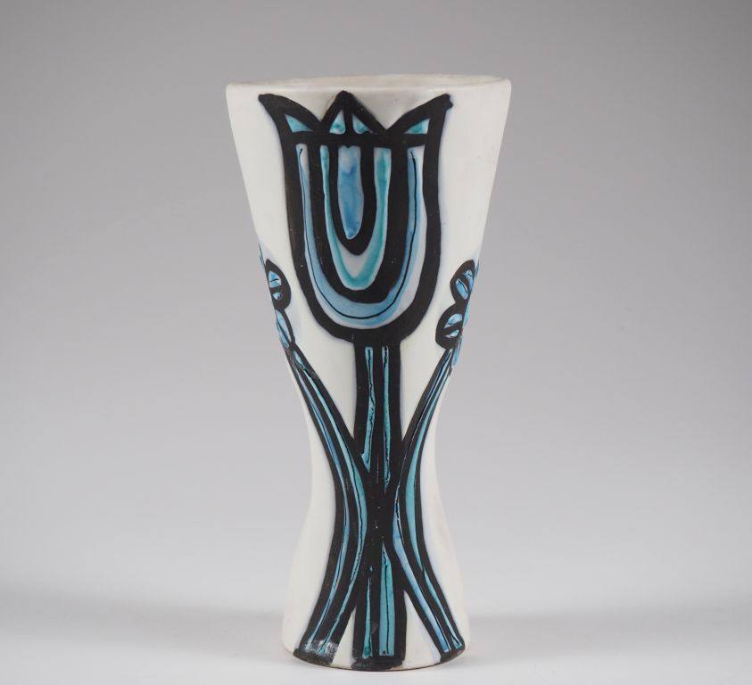 Roger CAPRON à Vallauris. Vase cornet en céramique polychrome à décor de fleurs. Signé. H. 20 cm. (Fel).