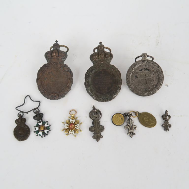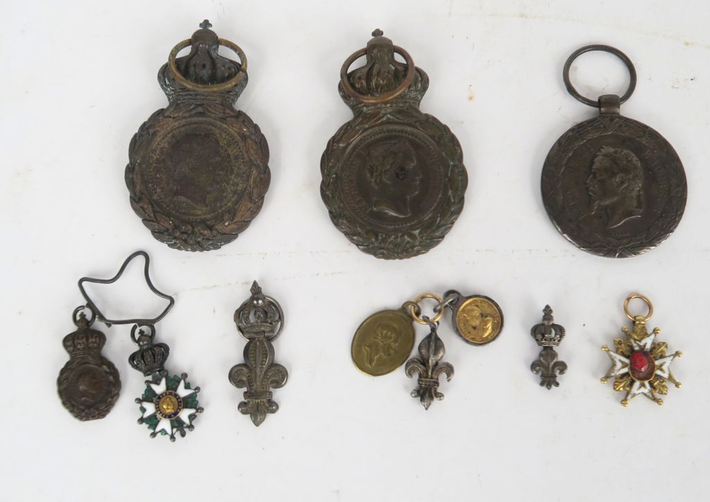 FRANCE DIVERS Ensemble présentant : -Trois décorations du Lys dont deux sous couronne. En argent. -Croix de Saint Louis miniature en or et émail (éclats, manques les centres) Poids brut : 1,8 g. -Deux médailles de Sainte Hélène, en bronze patiné (une fortement oxydée) -Une médaille de la campagne d’Italie par Barre en argent, attribuée sur la tranche « 8789 LEFEVRE 43e » -Une barrette déformée de deux miniatures chevalier de la Légion d’honneur Second Empire et médaille de Sainte Hélène.