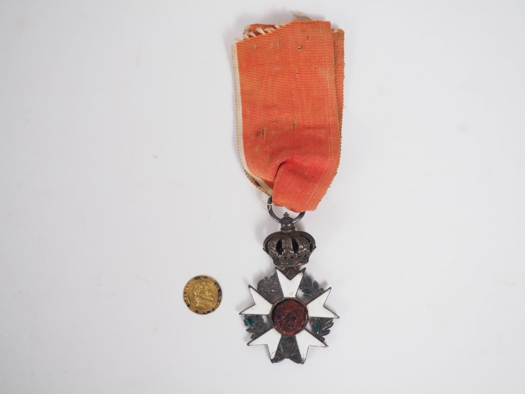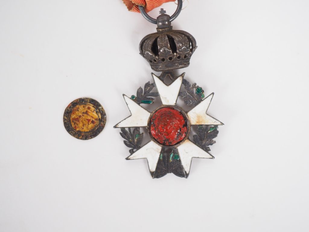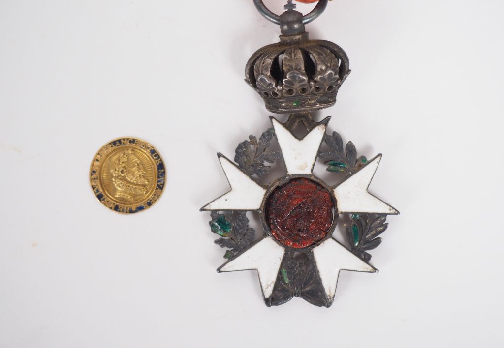 FRANCE ORDRE DE LA LEGION D’HONNEUR Etoile de chevalier du 3e type. Argent et émail (manque les centres, craquelures de chaleur.) Poinçon au faisceau de licteur Ruban moiré, à bande blanche. B. On y joint un avers de centre au profil Henri IV.