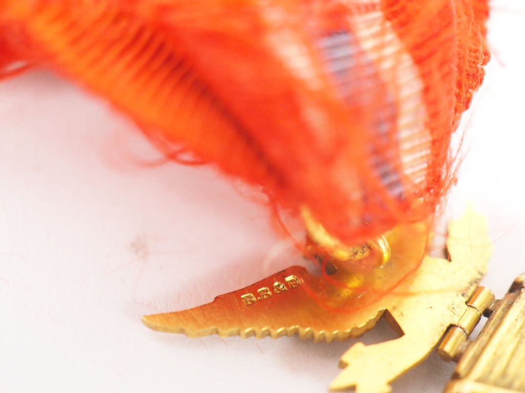 USA ORDRE DE LA CLOCHE DE LA LIBERTE Insigne de membre de Dieudonné Costes. En métal doré, émaillé à décor de la cloche de la Liberté (Liberty Bell). Reste de ruban avec agrafe et étoile d’argent. Dim. 6 x 4 cm. T.T.B. Historique : Après leur traversée de l’Atlantique, Costes et Bellonte sont reçus dans de nombreuses villes dont Philadelphie (dont la cloche de la Liberté est un des symboles) où le maire donne un diner en leur honneur. Œuvre en rapport : -On retrouve un insigne de cet ordre, probablement associatif, sur la brochette de miniatures de Maurice Bellonte, conservée au Musée de la Légion d’honneur et des ordres de chevalerie. Provenance : -Vente des souvenirs de Dieudonné COSTES, Maître Leblanc, 10 février 1992. Expert : Arnaud de Gouvion Saint Cyr