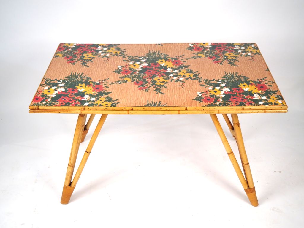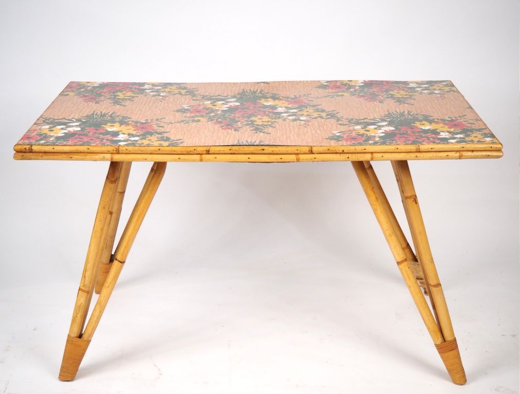 Adrien AUDOUX et Frida MINET. Table de salle à manger en bambou à 12 pieds réunis par un cerclage de rotin, plateau en formica à décor de bouquet de fleurs. Dim. 71,5 x 122 x 76 cm