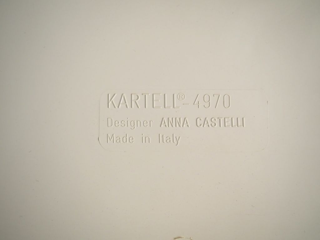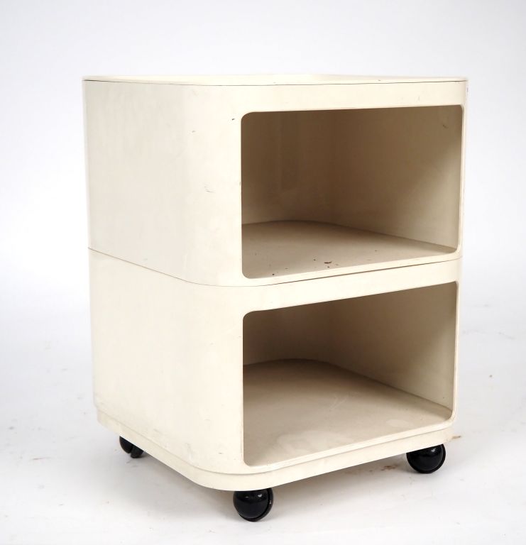 Anna CASTELLI pour Kartell. Chevet escamotable 1970 en plastique blanc, deux niches et un plateau cuvette amovible. Dim. 49 x 38 x 38 cm