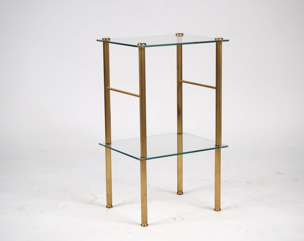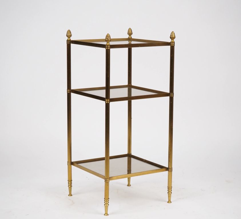 Bout de canapé années 70 en laiton doré, de style Louis XVI à décor de pommes de pin, à trois plateaux en verre fumé. Dim. 74 x 34 x 34 cm. On y joint un bout de canapé en laiton doré à deux plateaux en verre Dim. 60 x 35 x 29 cm