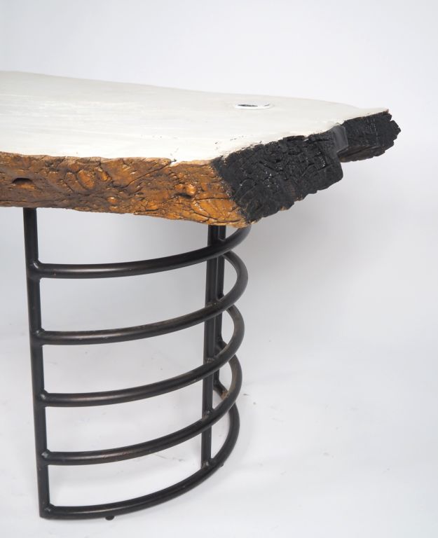 Bureau plat de créateur en bois massif laqué et bois plaqué, piétement en fer forgé. Dim. 76 x 150 x 96 cm