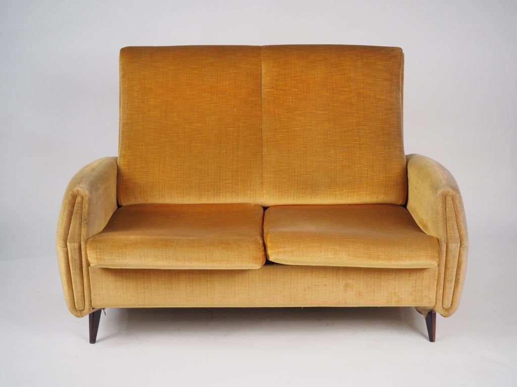 Canapé deux places années 50, garniture de velours jaune. (état d'usage)