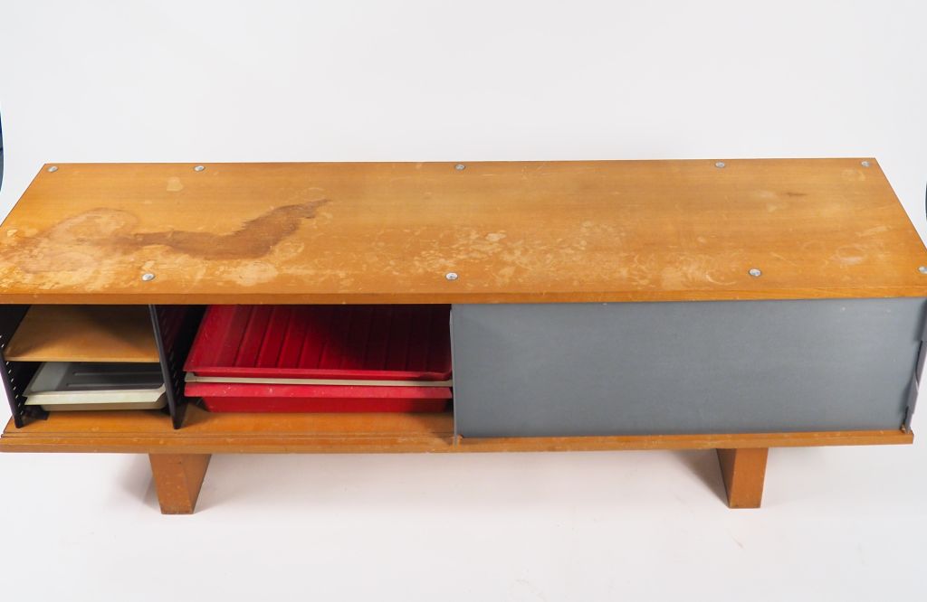 Charlotte PERRIAND. Bahut à joues avec portes coulissantes en polyester gris, fond en isorel laqué rouge, 1 tablette en bois et 7 tiroirs en plastique moulé rouge ou gris (4 grands et 3 petits). Modèle créé vers 1958 pour l'éditeur Steph Simon. Dim. 61 x 176 x 46,5 cm. (Tâches, petits accidents et certains tiroirs accidentés). Provenance : Collection particulière du sud-ouest de la France. Acheté vers 1960 à Alger (inscription au dos du meuble), déménagé en France 1961 et conservé dans la famille depuis toujours. Faisait partie d'un ensemble composé d'une table et de tabourets berger.