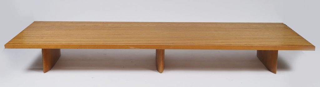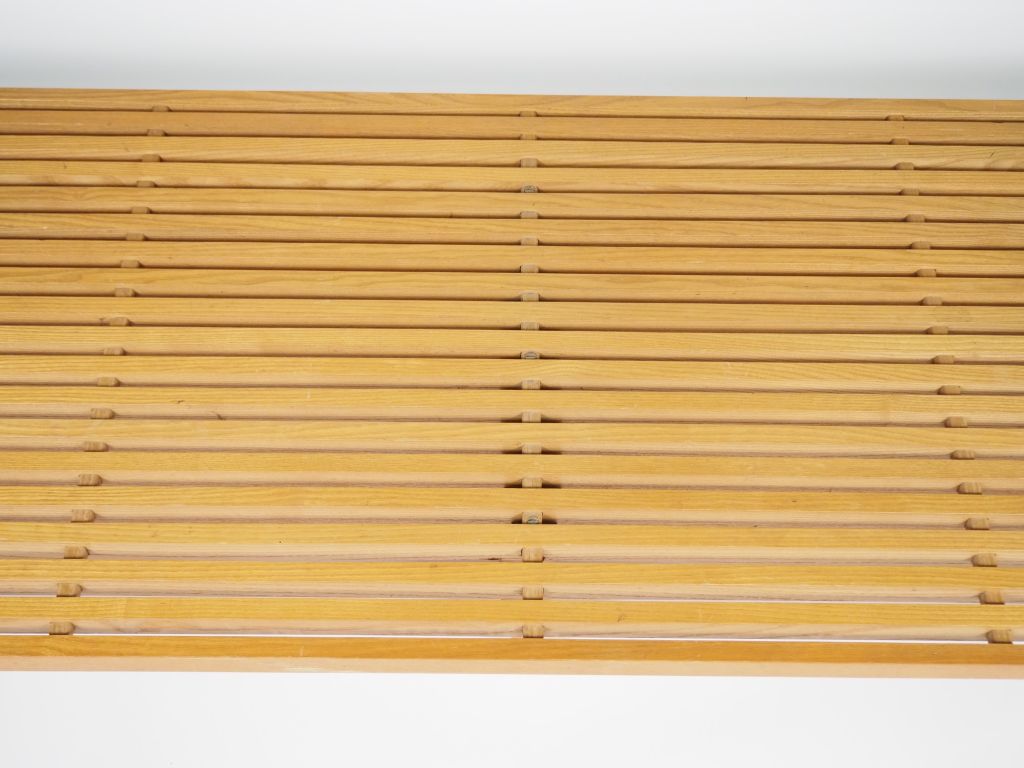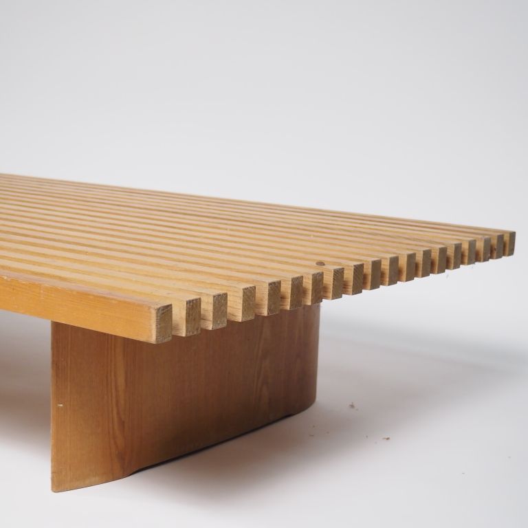 Charlotte PERRIAND. Banquette "Tokyo". Modèle créé en 1954 composé de lattes de bois assemblées parallèlement avec un jour entre elles, maintenues par trois pieds oblongs. Edition Steph Simon à partir de 1956. Circa 1959 Dim. 26,5 x 226 x 74 cm. Provenance : Collection particulière Toulouse, Acquise chez Steph Simon à l'occasion du cadeau de mariage de l'actuelle propriétaire en 1959. On y joint un élément de la banquette, indépendant et séparé. Trois lattes ont été sciées sur 11 cm afin d'adapter le meuble à la configuration intérieure de la maison des actuels propriétaires (afin que ce prolongement disposé en retour puisse passer sous un escalier). Les trois morceaux de lattes seront remis à l'acquéreur. Dim. 26,5 x 102,5 x 74,5 cm.