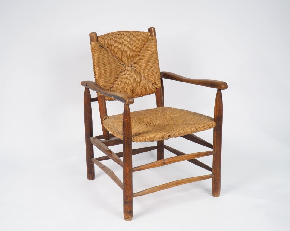 Charlotte PERRIAND. Fauteuil paillé N°21 années 60 dit « chamrousse » (modèle créé vers 1935). Structure en frêne massif, composée de quatre montants cylindriques reliés par des entretoises fuselées, assise et dossier en paille. Dim. 83 x 53 x 61 cm. (Tâches, petites usures). Provenance : Collection d'un architecte parisien, toujours resté dans la famille.