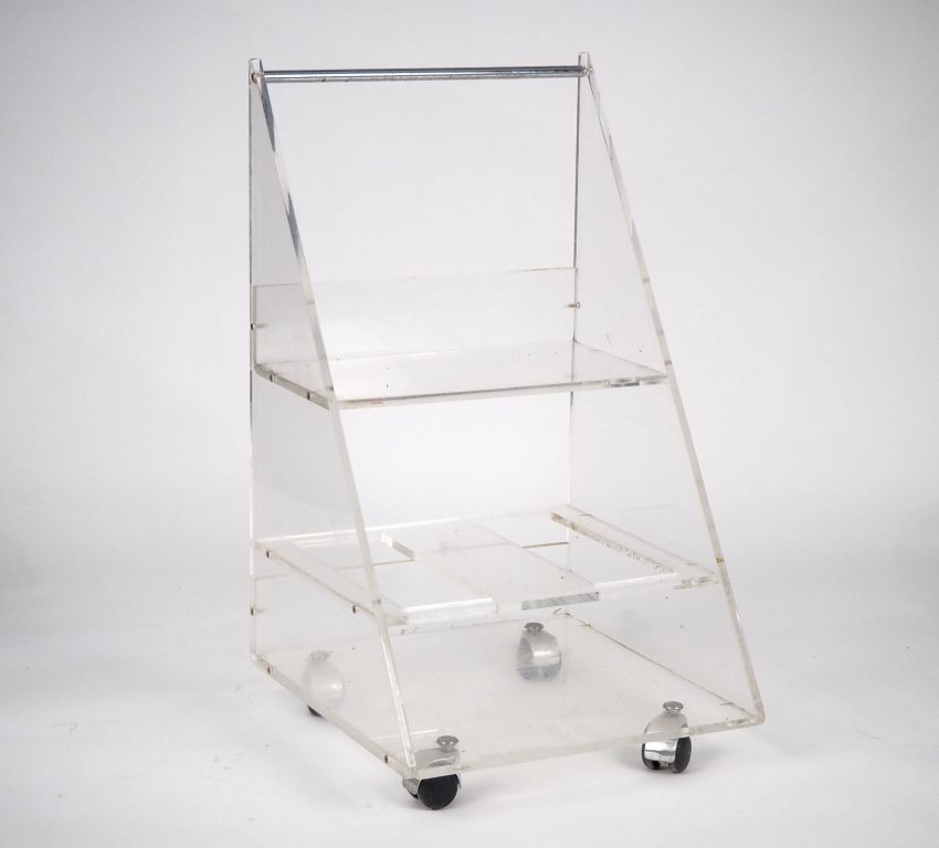 DAVID LANGE LES INVISIBLES DE MARAIS Desserte roulante années 70 en plexiglass, à trois plateaux, prise en métal chromé Signée Dim. 84,5 x 48 x 48 cm