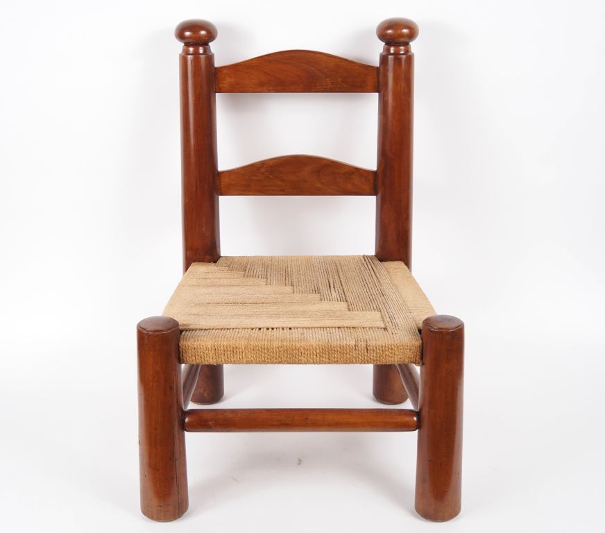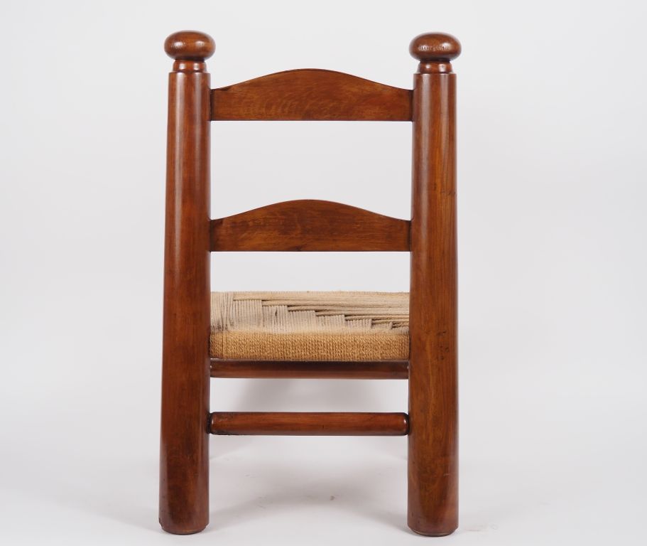 DUDOUIYT. (d'après). Chauffeuse en bois, assise en corde à décor géométrique. (restaurations) dim. 65 x 44 x 38 cm