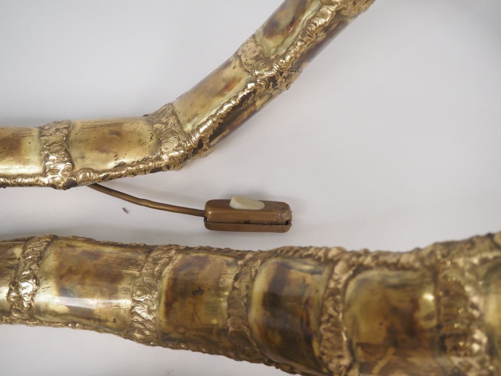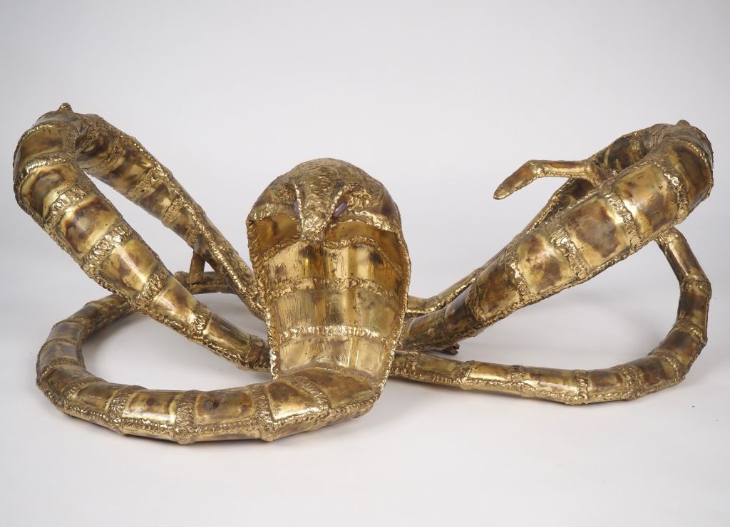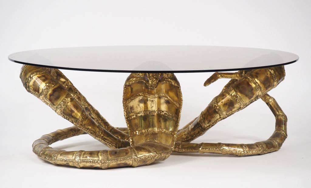 Henri FERNANDEZ. Table basse lumineuse "cobra" en laiton doré, les yeux en verroterie violette , plateau en verre fumé Dim. 37 x 107 x 63 cm