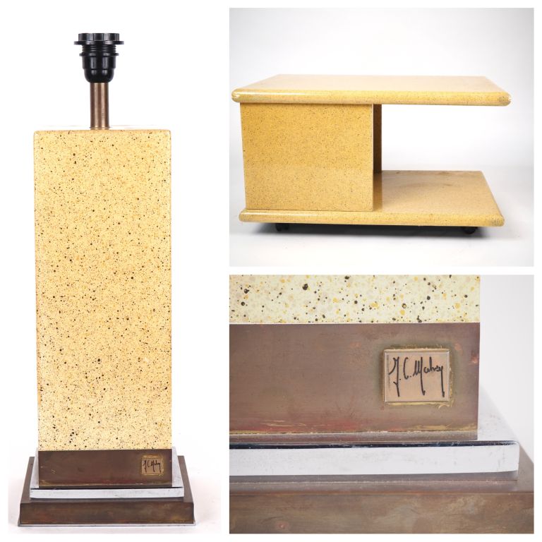 Jean Claude MAHEY. Desserte roulante et sa lampe en composition à l'imitation du marbre. Signées Dim. 46 x 80 x 50 cm