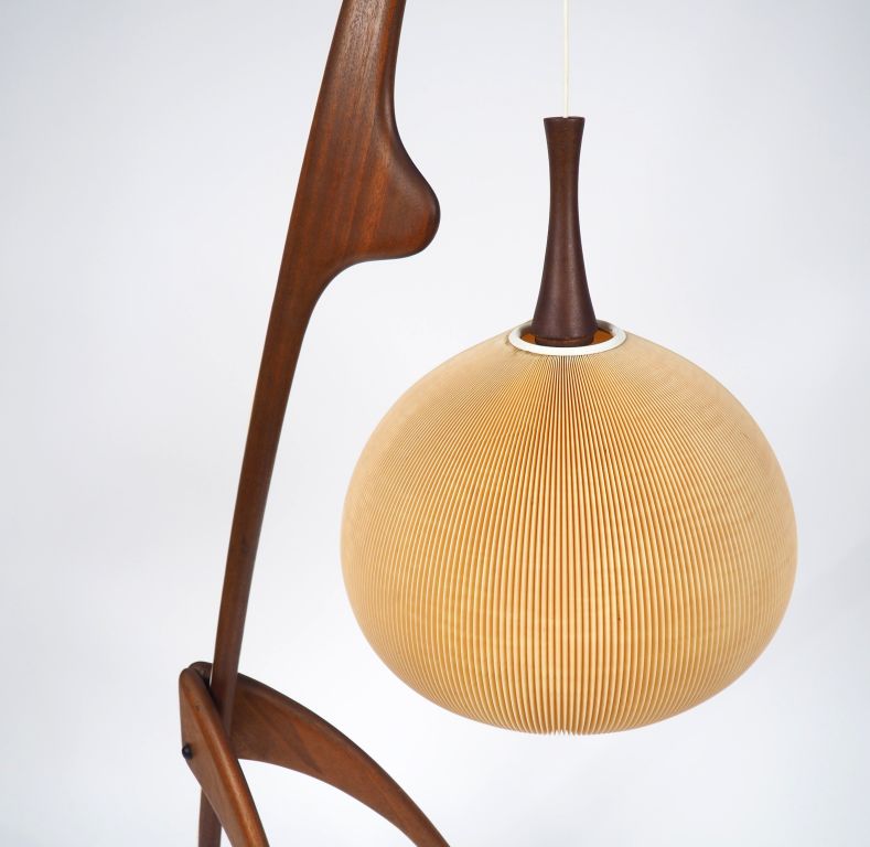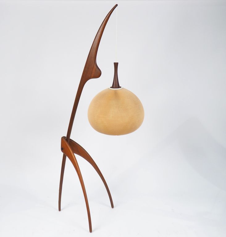 Jean RISPAL. Lampadaire biomorphique, modèle dit "Mante religieuse", piètement en teck teinté, abat-jour suspendu sphérique en acétate de cellulose plissée. H. 160 cm.