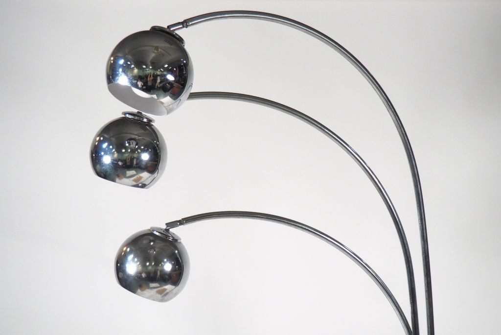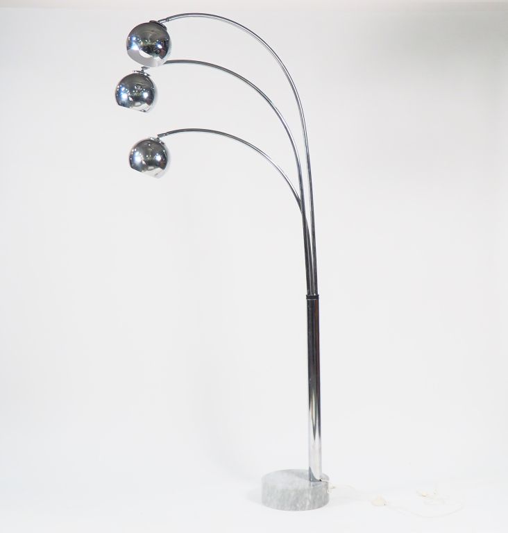 Lampadaire design à trois branches en métal chromé, base en marbre blanc, éclairant à trois lumières. H. 212 cm