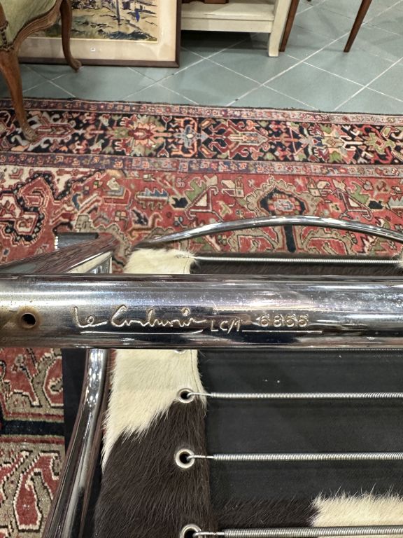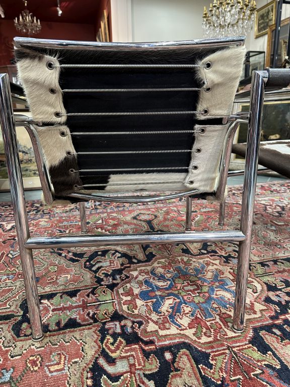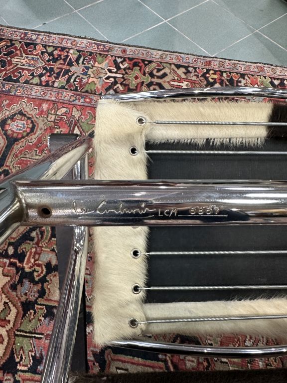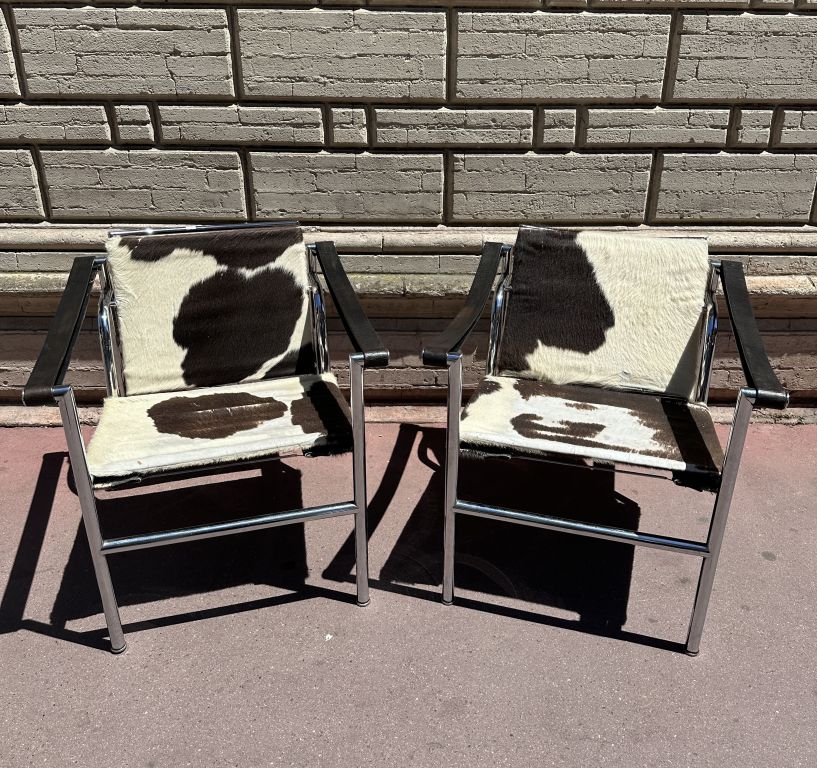 LE CORBUSIER, Pierre JEANNERET et Charlotte PERRIAND édition Cassina. Paire de fauteuils "LC1", modèle conçu en 1928. Structure tubulaire en acier chromé, cuir et peau de vache. Signés, numérotés 6955 et 6867 H.71 - L. 64 - P. 68 cm.