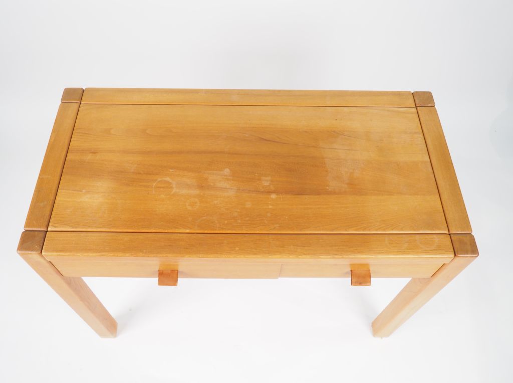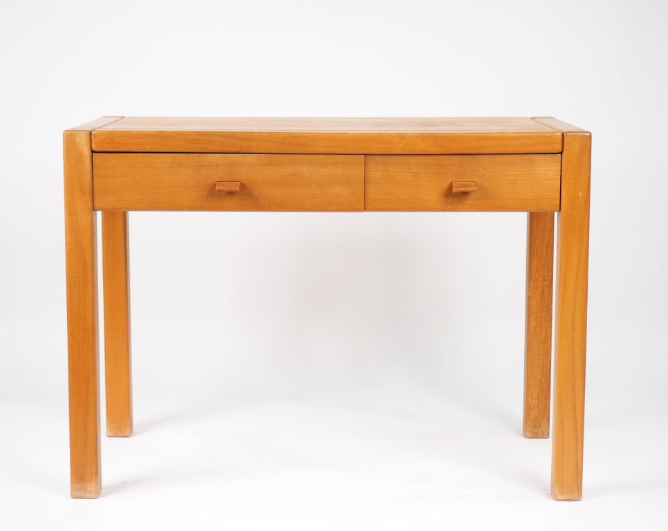 Maison REGAIN. Bureau en orme massif, ouvrant à un tiroir en ceinture agrémenté de deux languettes de cuir. Dim. 77 x 107 x 52 cm.