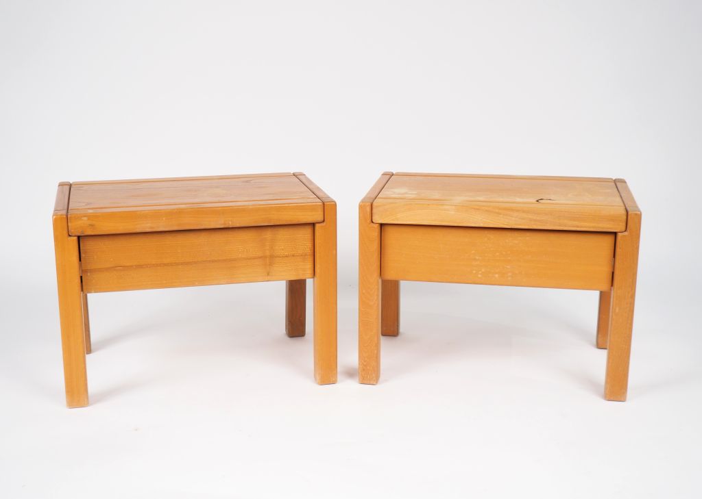 Maison REGAIN. Paire de chevets en orme massif, ouvrant à un tiroir. D...