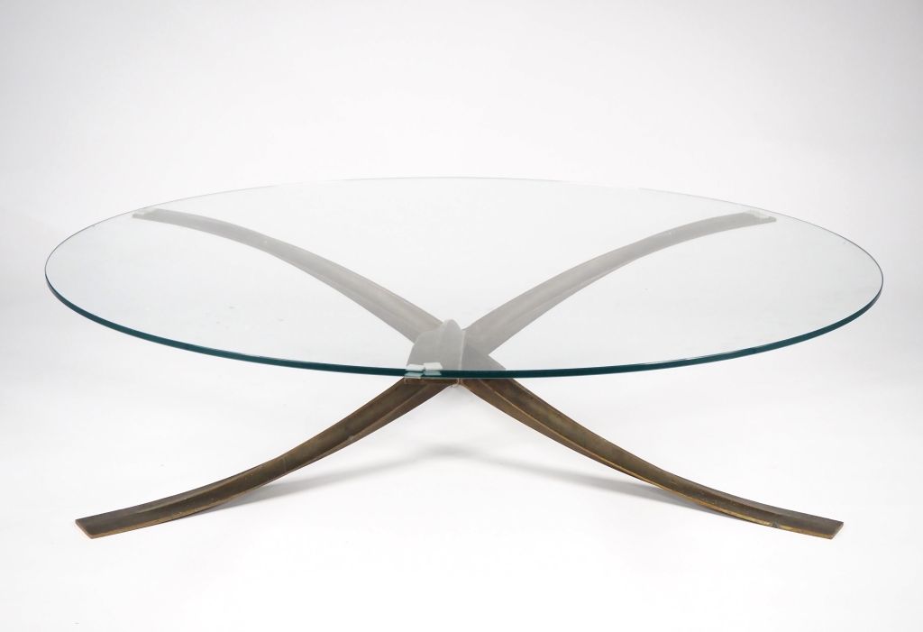 Michel MANGEMATIN. Table basse piétement étoilé en bronze, plateau verre. Diam. 125 cm