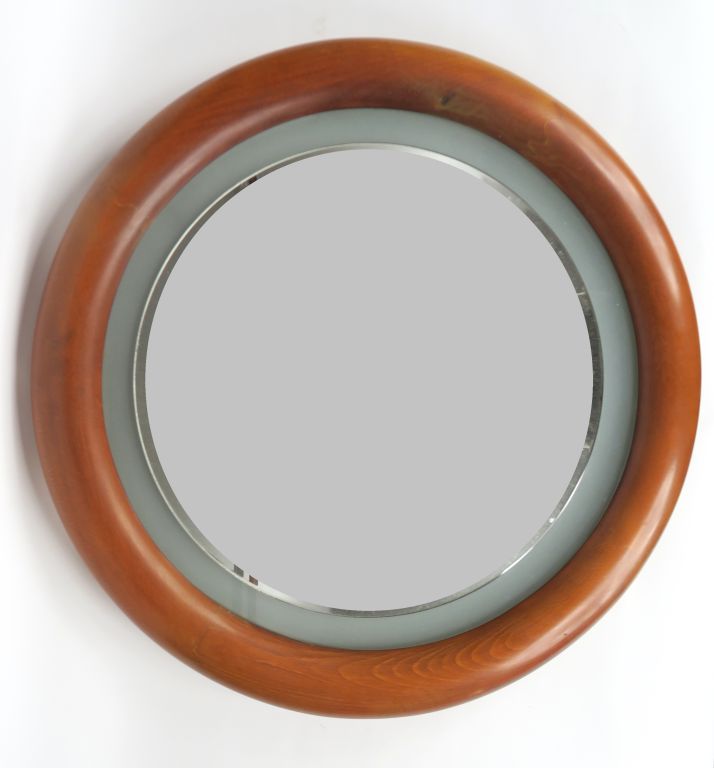 Lot de Miroir électrifié 1970, cadre en bois teinté. Diam. 73 cm au prix de 100 à 150 € en vente aux enchères par l'hôtel des ventes Primardeco