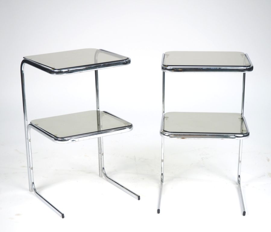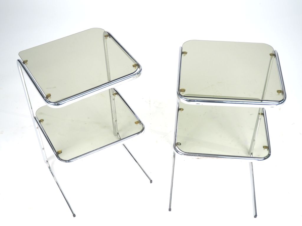 Paire de bouts de canapés, piétement en métal chromé, deux plateaux en verre fumé. Dim. 59 x 34 x 32,5 cm