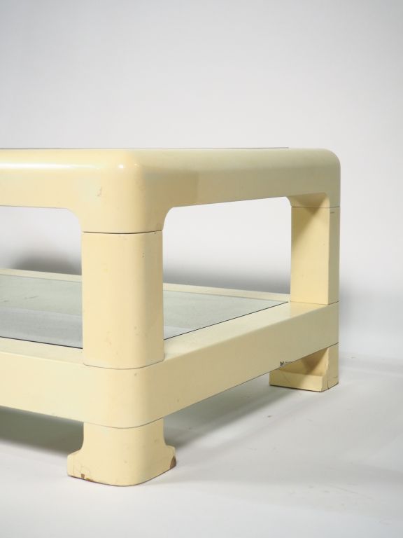 Peter GHYCZY. Table des années 70 en plastique blanc, deux plateaux en verre. Dim. 46 x 138 x 70 cm (petits accidents)