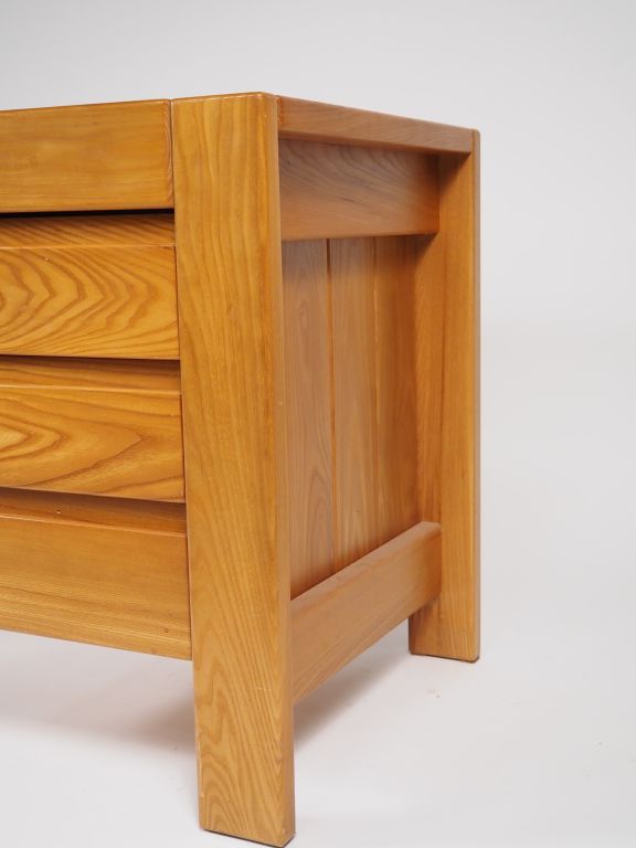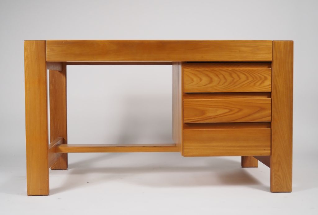 Roland HAESSLER pour MAISON REGAIN. Bureau à caisson années 70 en orme massif, trois tiroirs Modèle primé en 1973 par le prix R. Gabriel. Signé. Dim. 75 x 125 x 58 cm.