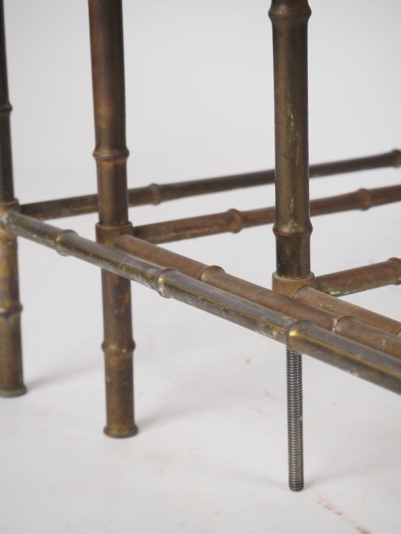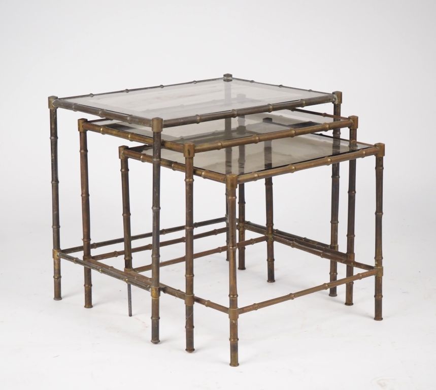 Suite de trois tables gigognes années 70 en laiton et verre, à l'imitation du bambou. Dim. 47 x 52 x 38,5 cm (oxydations et manques de laiton à un pied)