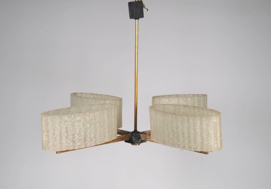 Suspension 1960 en laiton et verre granuleux, éclairant à quatre lumières. Dim. 53 x 80 cm