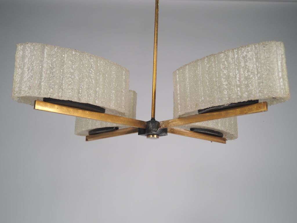 Suspension 1960 en laiton et verre granuleux, éclairant à quatre lumiè...