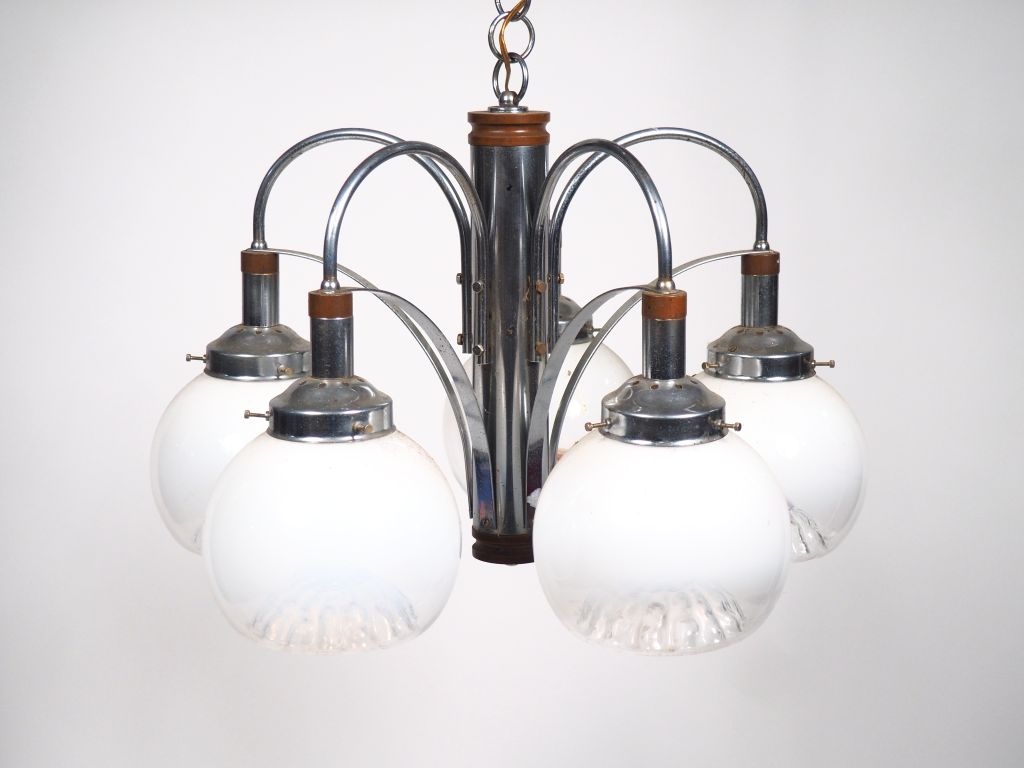 Suspension 1970 en métal chromé et verre opalin, éclairant à cinq lumières.