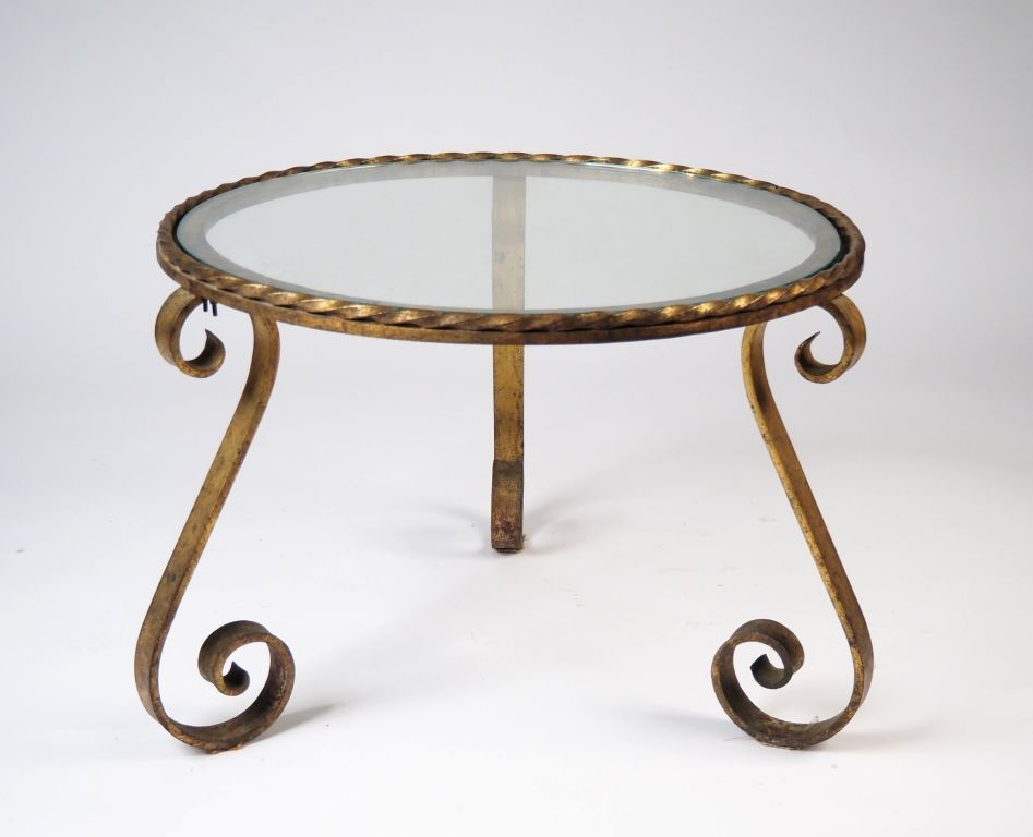 Table basse 1950 en fer forgé doré, piétement tripode en forme de console. Diam. 75 cm