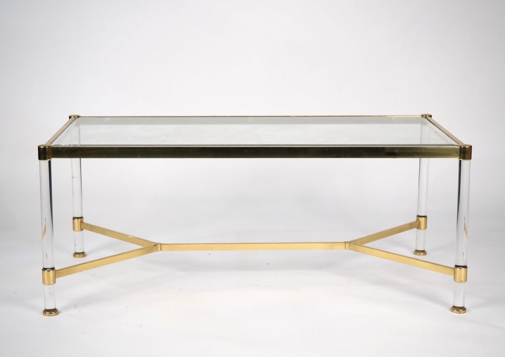 Table basse années 70 en laiton doré et plexiglass, plateau verre, quatre pieds réunis par une entretoise. Dim. 45 x 111 x 57 cm