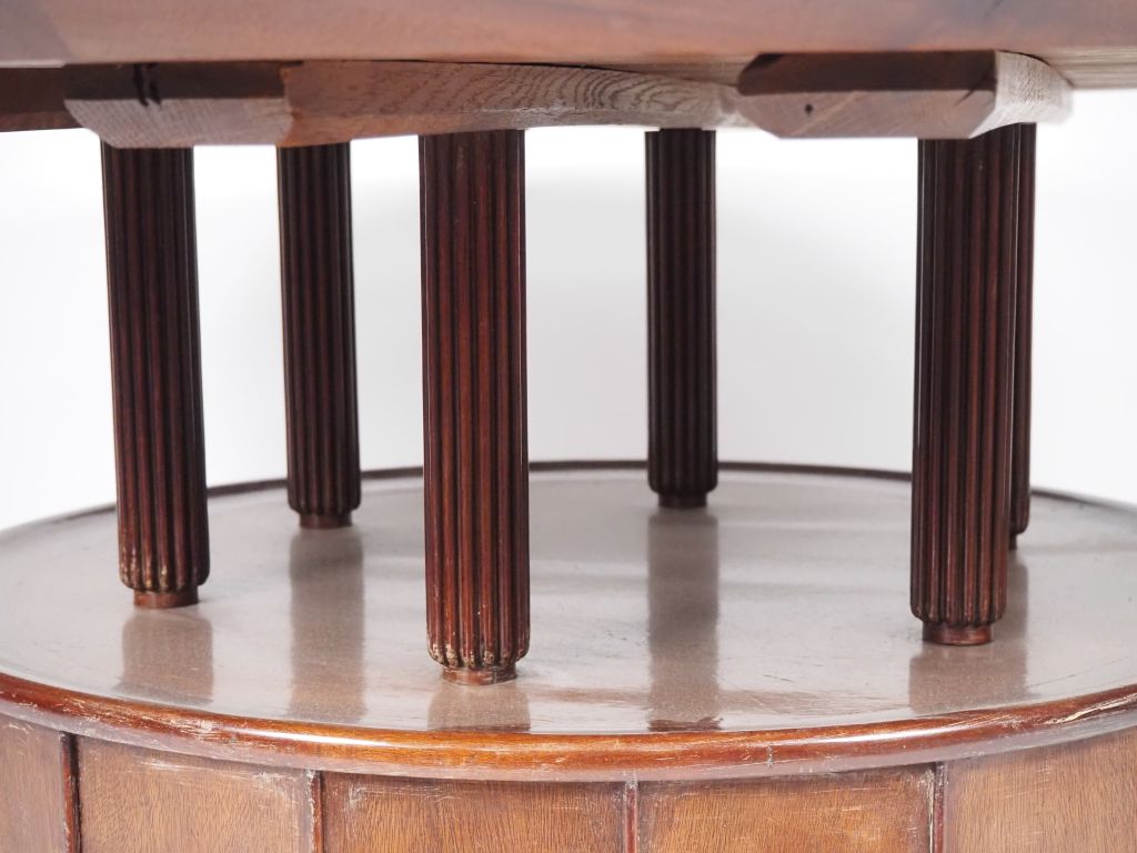 Table ronde de style Art Déco en acajou massif et placage d'acajou, grand plateau circulaire supporté par 6 cylindres à godrons. Base facetée. Dim. 62 cm diam. 138 cm