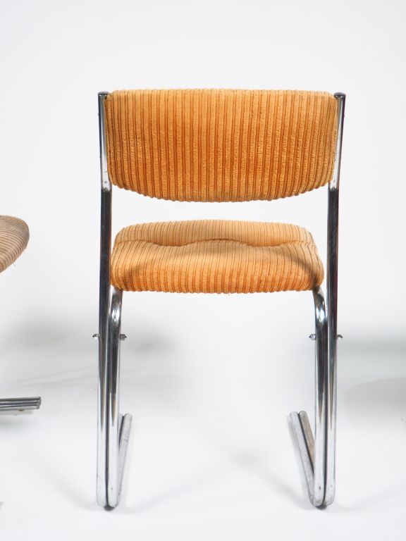 Trois chaises des années 70 en métal chromé garniture de velours côtelé. (accident sur la garniture d'une des chaises).