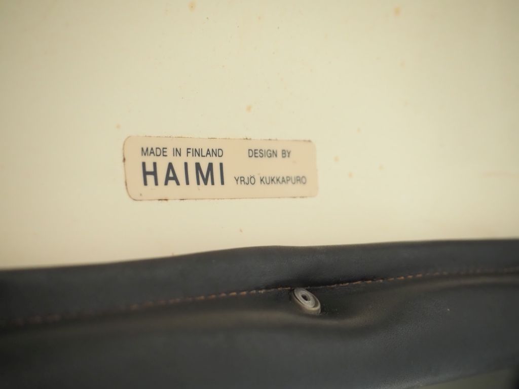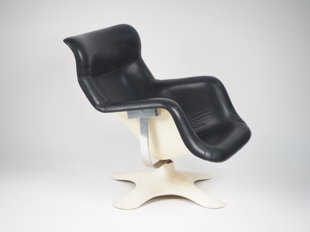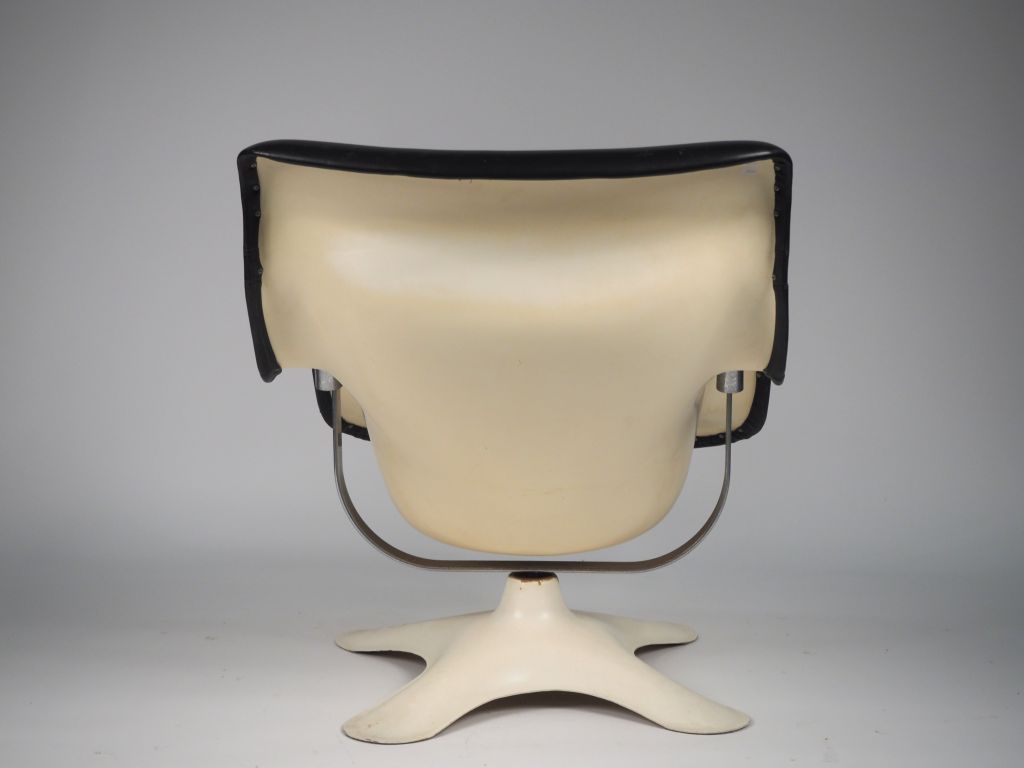 YRJO KUKKAPURO. Fauteuil Karuselli. Coque en fibre de verre, piétement en métal laqué blanc et garniture de cuir noir, assise tournante Dim. 50 x 80 x 51 cm (enfoncement au dossier)