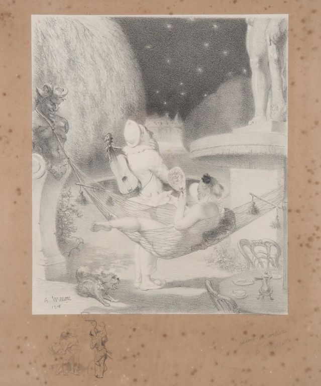 Adolphe WILLETTE. "Scène galante dans la nuit étoilée". Dessin, signé en bas à gauche et daté 1916. Dim. (à vue) : 35 x 29,5 cm.