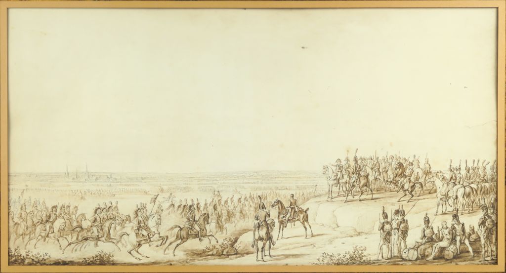 Attribué à Horace VERNET (1789-1863) "La revue des troupes par Napoléon, probablement dans la vallée du Niemen" Plume et encre brune, lavis brun sur esquisse au crayon noir, rehauts de gouache blanche oxydés 36 x 68 cm Numéroté au crayon bleu « 436 » en bas à droite sur le montage ancien. Insolé, déchirure à droite Notre dessin présente de fortes similitudes avec la paire de dessins d’Horace Vernet illustrant la rencontre de l’Empereur et du Tsar sur le Niemen et déposés par le musée du Louvre au château de la Malmaison MM.40.47.6863, RF29122 et MM.40.47.6864, RF29121) Expert : Cabinet de Bayser