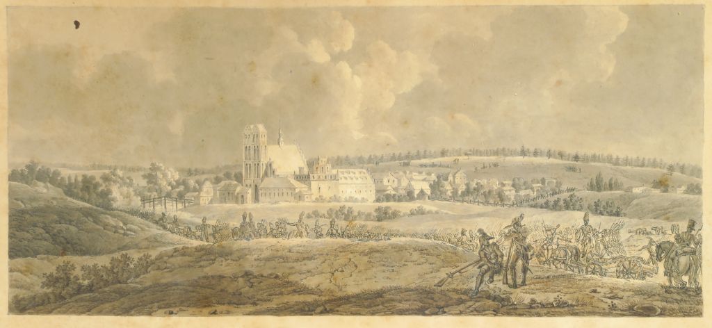 Attribué à Nicolas-Antoine TAUNAY (1755-1830) "Mouvement de troupes vers Eylau" Plume et encre noire, lavis brun sur traits de crayon noir, rehauts de gouache blanche oxydés 23 x 51,5 cm Numéroté au crayon bleu « 404 » au verso. Insolé, trous, petites taches Expert : Cabinet de Bayser