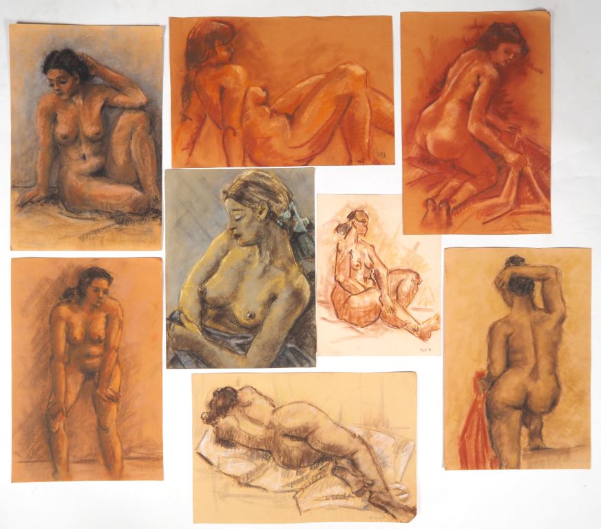 Bel ensemble de 8 dessins et d'une peinture à l'huile "Etudes de jeunes femmes nues".