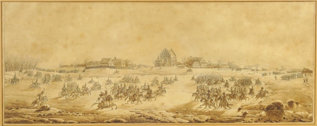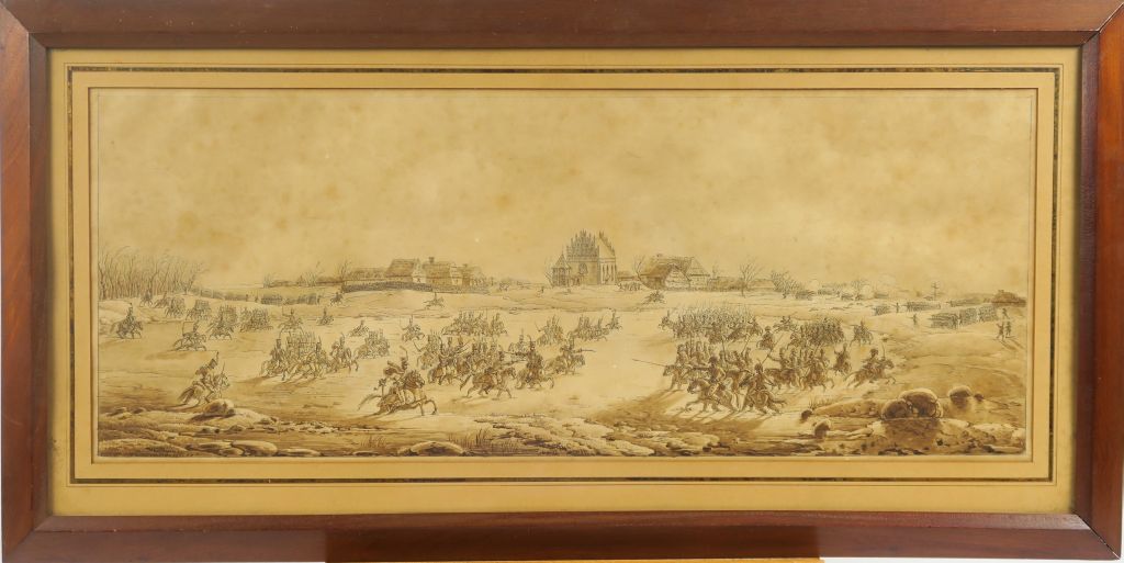 Benjamin ZIX (1772-1811) "La bataille de Golymin en Pologne, le 26 décembre 1806" Plume et encre noire, lavis brun 24 x 60,5 cm Porte un numéro en bas à droite au crayon bleu, ce sujet correspondant à un dessin préparatoire dans l’album et numéroté « 396 ». Situé et daté au verso de l’encadrement, ancienne étiquette : « extrait de la revue Miroir ou l’Histoire/en 1805 le général Klein commande la première division de dragons il est né à Blamont (Meurthe et Moselle) le 24 décembre 1806 il prend au général Blueber 1000 prisonniers, deux drapeaux le 28 décembre 1806 avec le général Nansity ? il remporta un avantage signalé à Kolozeinb ? et à Golymin en Pologne/il est tué à Eylau » Insolé, rousseurs Expert : Cabinet de Bayser