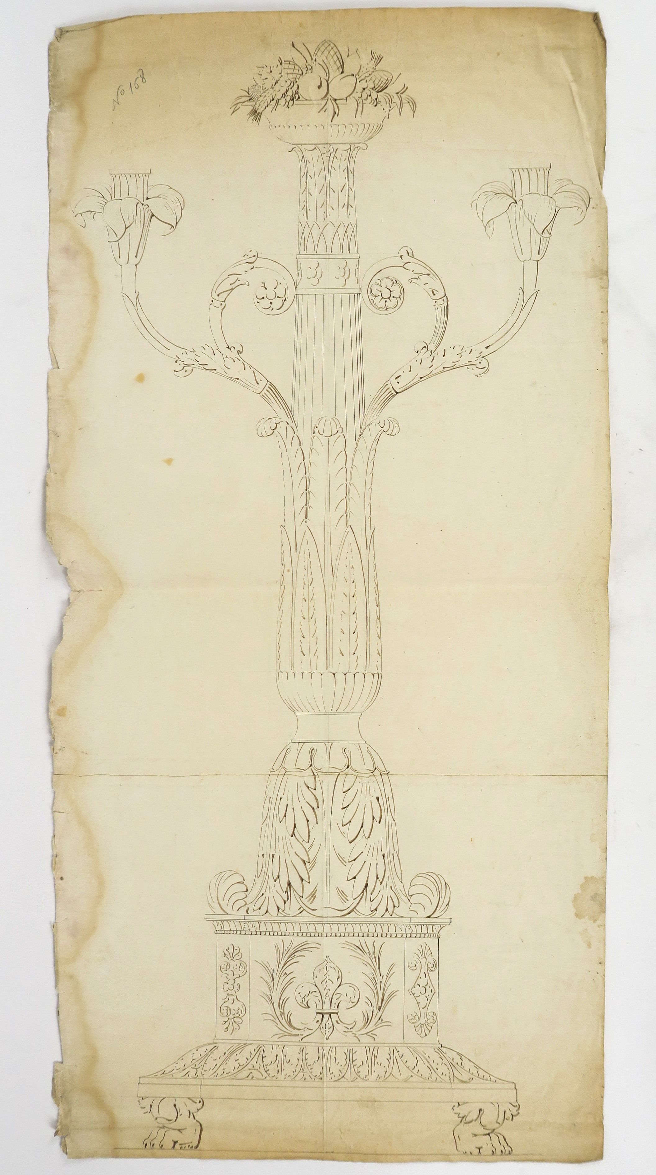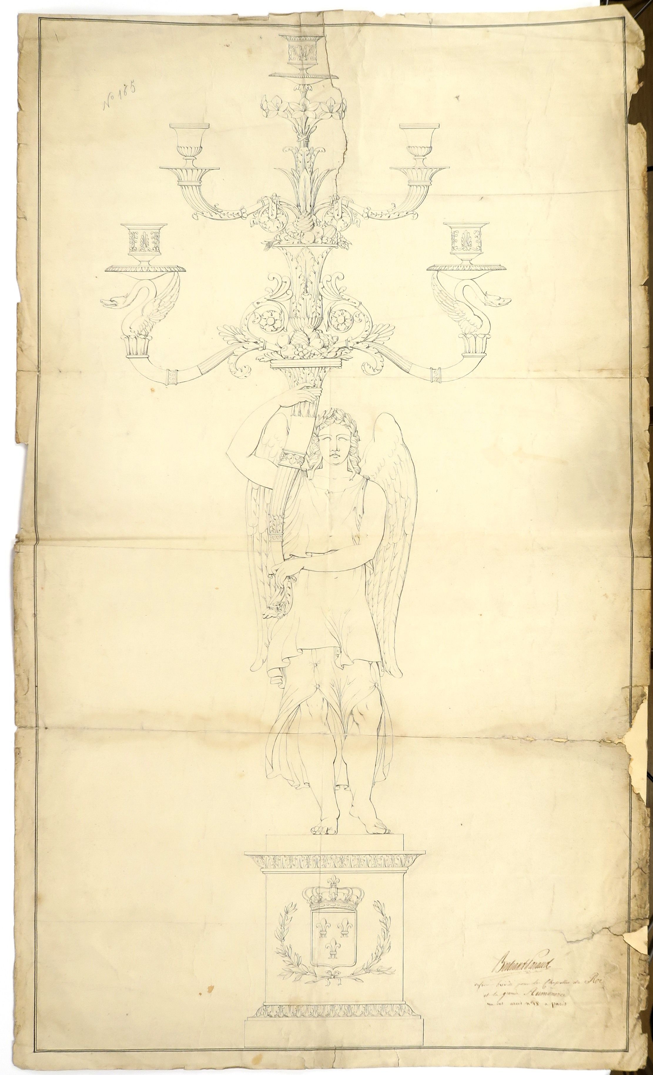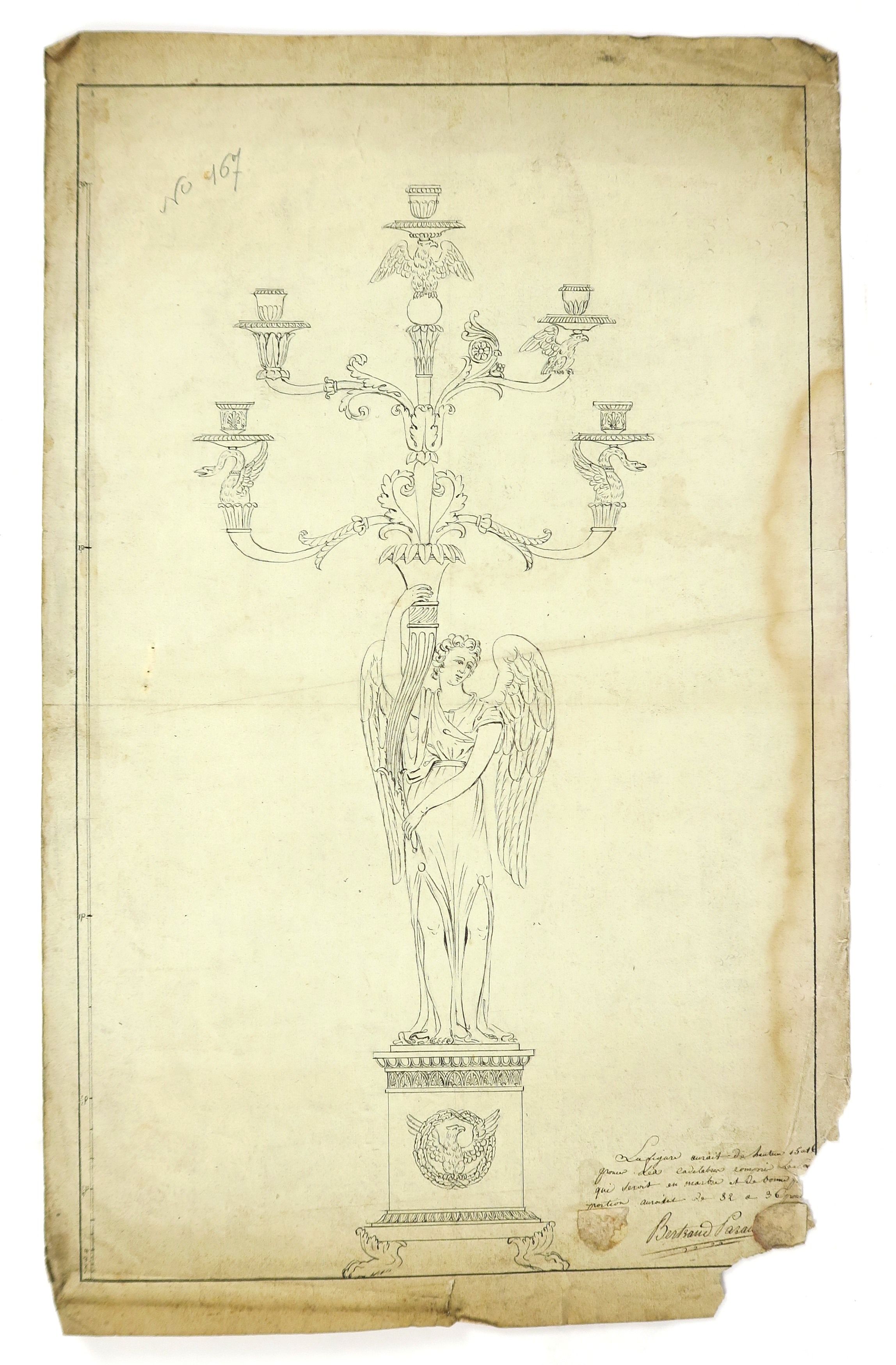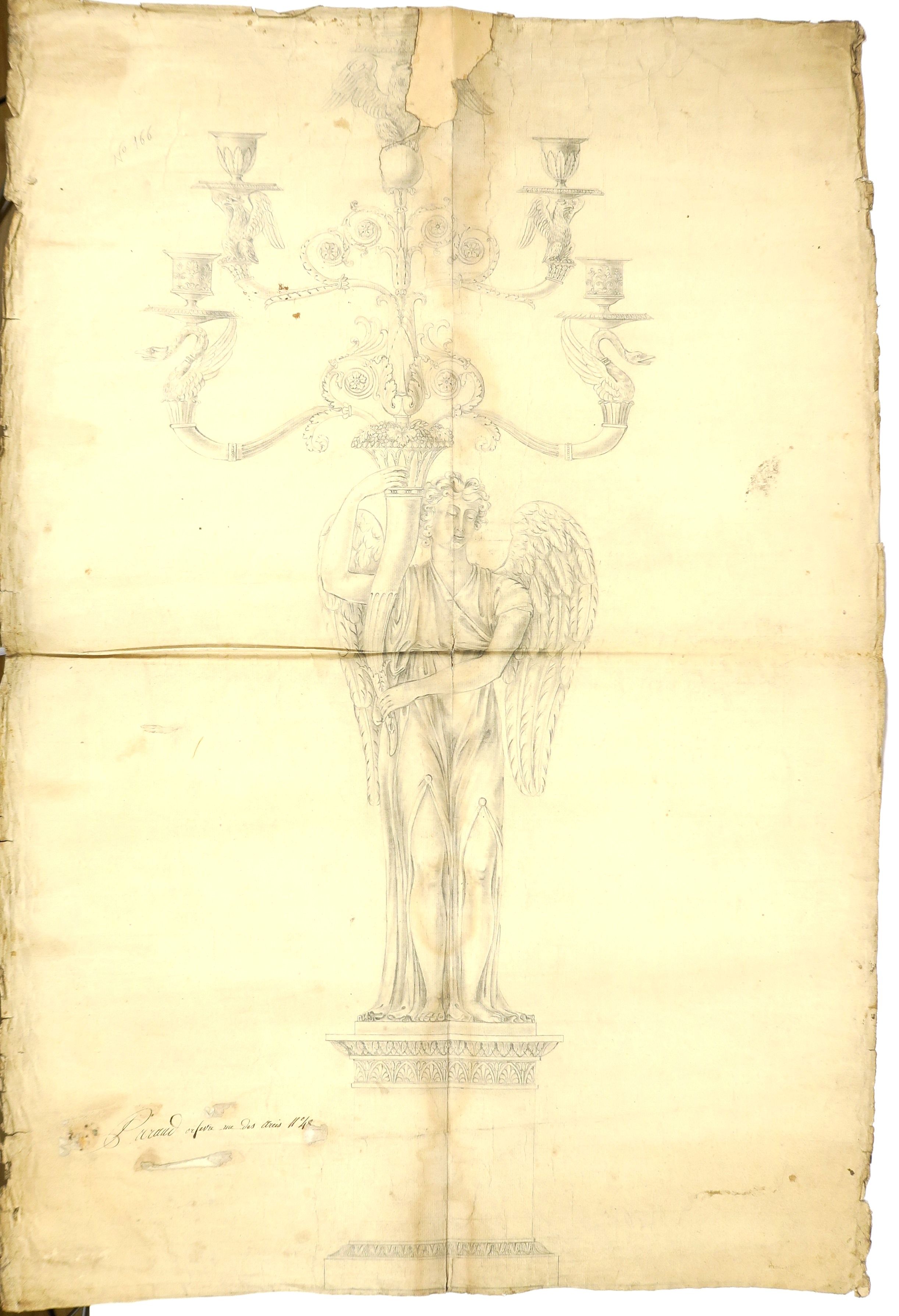 Bertrand PARAUD, orfèvre pour les Chapelles du Roi et la grande Aumônerie « Projet de candélabre ». Dessin, XVIIIème. Signé. 101 x 60 cm On y joint un ensemble de 14 dessins « Projets de candélabres et de reliquaires » (accidents) B. PARAUD « Grand candélabre avec un ange » Dessin. Signé. 98 x 65 cm (accidents) Ecole française XIXème « Projet pour un candélabre, décor de feuilles d’acanthe » 77.5 x 37.5 cm (accidents) Bertrand PARAUD « Projet de candélabre, à décor d’ange portant un candélabre figurant une corne d’abondance » Signé. 51 x 31.9 cm (accidents) Bertand PARAUD « Projet de candélabre, à décor d’un ange sur un socle » 69 x 43.5 cm Signé. (accidents) Bertrand PARAUD « Projet » Dessin. Signé. 18.5 x 31 cm (accidents) Bertrand PARAUD « Projet de baisers de paix » Dessin. Signé. 29 x 44 cm (accidents) Bertrand PARAUD « Projet pour un candélabre » Dessin. Signé et daté mars 1817. 40 x 26.5 cm Ensemble de 6 dessins pour des projets de hauts de candélabres. Signés Bertrand PARAUD ou Emilie PARAUD. (accidents)